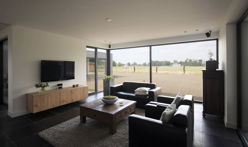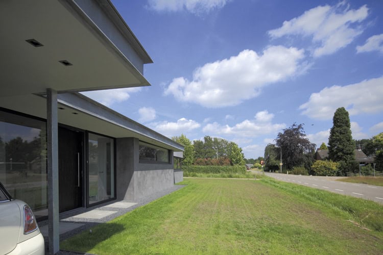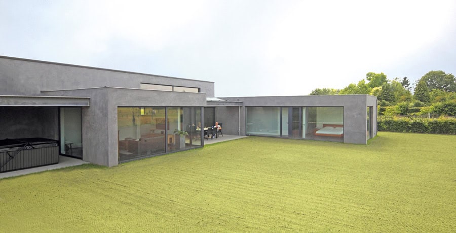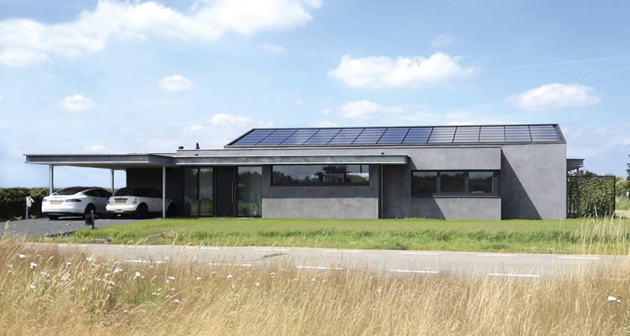 De opdrachtgever van de afgebeelde woning wilde een moderne, strakke bungalow. Het bestemmingsplan eiste een schuin dak. Binnen deze randvoorwaarden is het ontwerp ontstaan. De onderhoudsarme gestuukte gevels, de stalen profielen rond de overstekken, de grote raamvlakken en de zichtlijnen in de woning zijn modern. Het schuine dak met de zonnecollectoren bezorgt de bungalow ook van binnen ruimtelijkheid en een mooie lichtval. In de woning zijn een aantal vernieuwende technieken en materialen toegepast. Zo zijn de gevels gemaakt van geïsoleerde keramische porotherm (metsel)blokken, is het stucwerk (ook van de wanden van de badkamer) van coprox, hét waterdichte, stijlvolle alternatief voor tegels en regulier stucwerk, dat keihard en door en door gekleurd is. De zonnepanelen zijn volledig geïntegreerd in de strakke dakafwerking.’