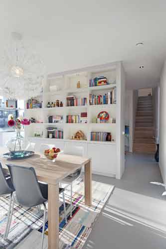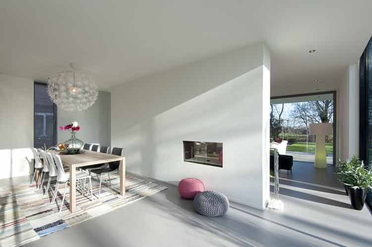 De vormgeving van het interieur (met inbouwspots met ledverlichting) en de manier waarop verschillende woonfuncties in elkaar overlopen zijn toegespitst op het hedendaags ruimtegebruik, waarbij licht en lucht een hoofdrol spelen. De strak gegoten vloer op de begane grond heeft vloerverwarming. De open keuken vormt het centrum van de woning, je komt er altijd langs. De woonkamer is intiem, met een doorkijkhaard die ook de eetkeuken verwarmt. Tussenwanden staan los van de gevels waardoor ze een open begrenzing vormen tussen verschillende woonfuncties. De slaapverdieping is besloten vormgegeven met smalle, verticale openingen en kozijnen achter metselwerk. De ‘master bedroom’ beschikt over een eigen badkamer.