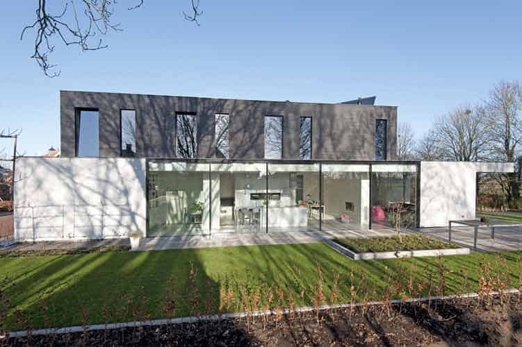 De woning in Twello is een langgerekt, rechthoekig volume met aan de achterzijde een grote, vrijdragende luifel. Op de gevel van de begane grond sluit glad betonstuc aan op zwarte, langwerpige betonstenen waarmee de verdiepingsgevel is bekleed. Op de begane grond zorgen grote glasvlakken voor een open verbinding naar de tuinzijde en voor een overweldigende daglichttoetreding. De gesloten gevel aan de kant van de naastgelegen kavel zorgt voor privacy.