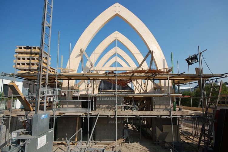 Constructiemethode: houten spanten met betonnen vloeren en houtbeton gevels.