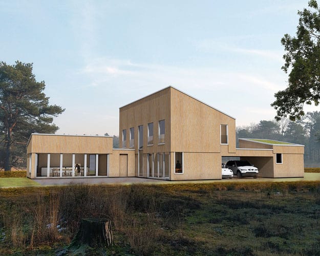 De energieneutrale woning in Strijbeek is opgetrokken uit houtskeletbouw met een gevelbekleding van houten latten. Het huis heeft op de begane grond een woonkamer en een aparte woonkeuken met uitzicht op de tuin. Aan de voorzijde is een werkkamer die je ook als gelijkvloerse slaapkamer kunt inrichten. De slaapkamerverdieping heeft drie slaapkamers, een logeerkamer en een badkamer.
