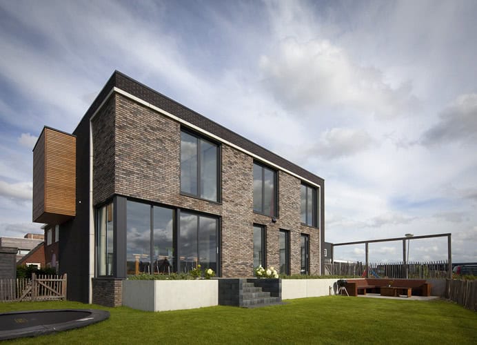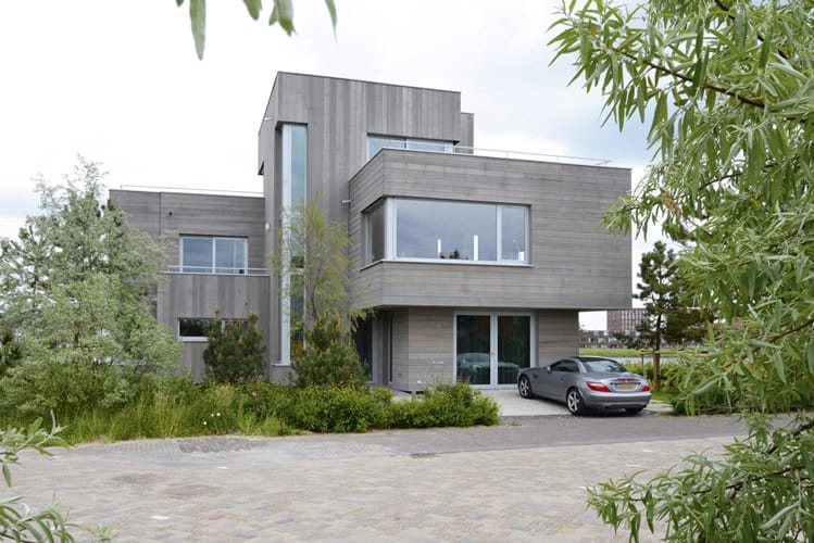 Gevelmateriaal: baksteen en gemodificeerd hout (vergrijzend).