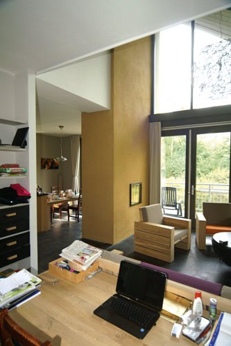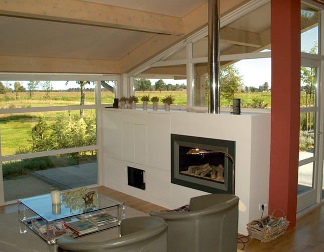 De Vos architecten was al ecologisch toen “duurzaam bouwen” nog geen modewoord was. Ons eerste écht ecologische huis ontwierpen we toch pas in 1996. Geheel zonder beton en nul-op-de-meter. Houtskeletbouw, leemstuc binnen, kalkstuc buiten, sedum en PV-panelen op het dak, vlaswol als isolatie in een dampopen constructie en als hart van het huis een haard: een leemkachel met een buffervat en vloerverwarming. Jaarlijks nog wel 20 kuub hout voor warmte, warm water en koken, dat kan nu beter. Maar die èchte warmte van een kachel: dat is een oerbeeld, een archetype, net als eerlijk materiaalgebruik, materiaaleigen kleuren: de warmte van hout, de zachtheid van leemstuc.’