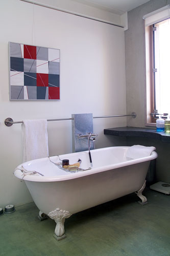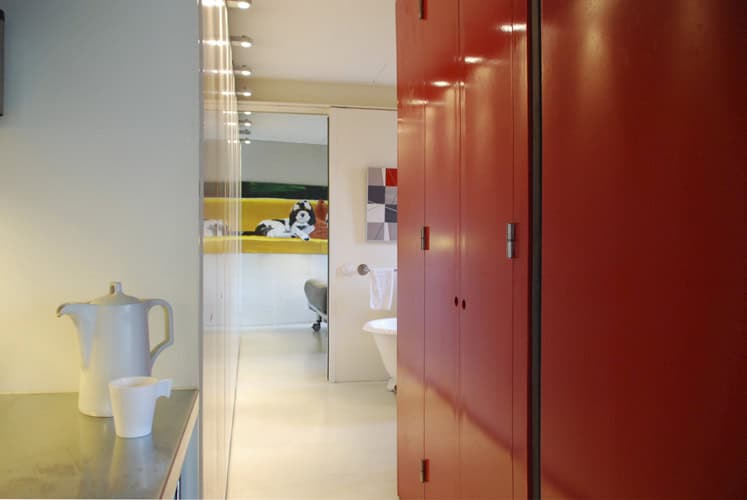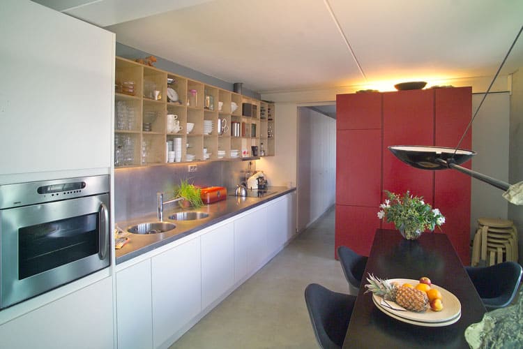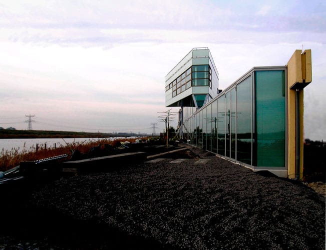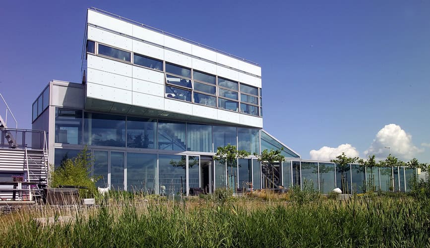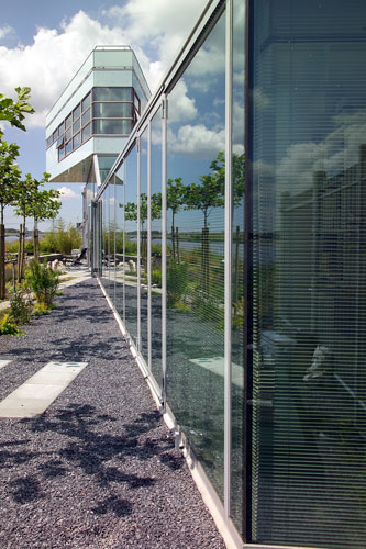 De woon-werkwoning aan het water in Amsterdam (IJburg) heeft naar de straatkant een gesloten gevel van geel beton en een rietstructuur. De gevel aan de waterzijde is van veel glas voorzien, wat een weids uitzicht over het water biedt.