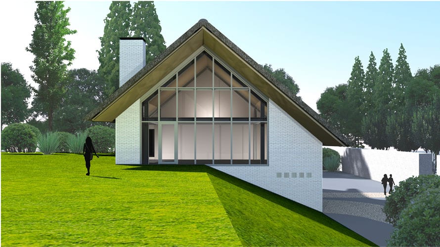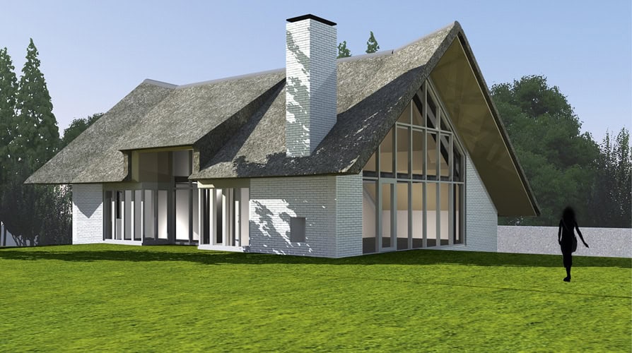 De villa in het Gooi is ontworpen met raampartijen die overal uitzicht op de tuin bieden en een grote rieten kap die ver over de raampartijen uitsteekt.
