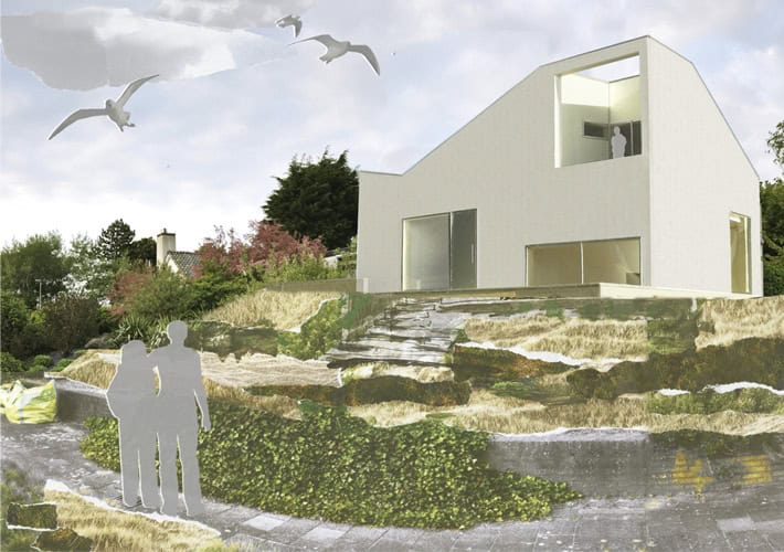 Bij de villa in Hoek van Holland, die als een sculptuur op een duin ligt, kijk je vanaf het boventerras rechtstreeks uit over de zee.