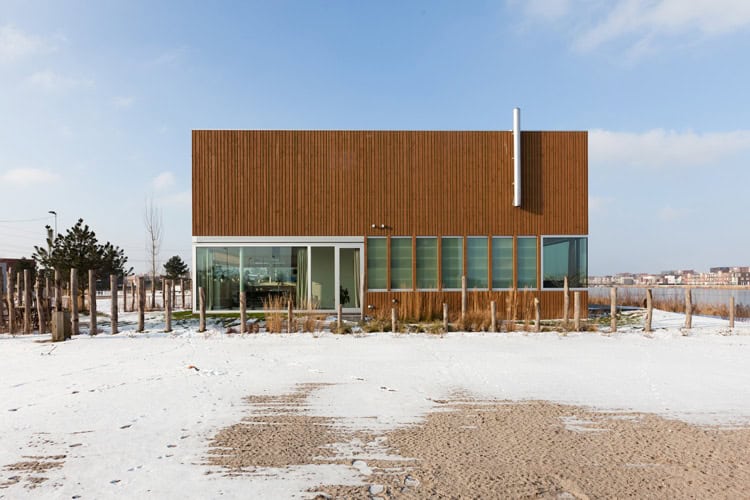 Het vrijstaande woonhuis op Rieteiland Oost ligt pal aan de waterkant en is zorgvuldig in de waterrijke omgeving ingebed. Door zijn open en panoramische kwaliteiten wordt een groot gevoel van ruimte gecreëerd. Het vrijheidsgevoel weerspiegelt de wens van de opdrachtgevers en karakteriseert het ontwerp. Het huis is een sculpturaal volume in hout waarin ruimschoots openingen zijn gespaard voor het zicht op het panorama. (Belangrijkste uitgangspunt bij het ontwerpen was het vrije uitzicht over het water.) De achterzijde bestaat geheel uit glazen puien die toegang bieden op het vlonderterras en het pandbrede balkon. De puien worden subtiel omkaderd door dezelfde gevelstructuur in hout waardoor het volume een plastische uitstraling krijgt. De entree (aan de voorzijde) wordt geaccentueerd door een omlijsting in beton. Naast de entree bevindt zich de keuken. De woonkamer (aan de achterzijde) is gericht op het water. Het terras en de tuin zijn op het zuidoosten georiënteerd.