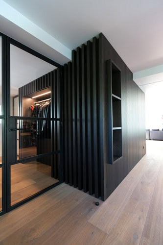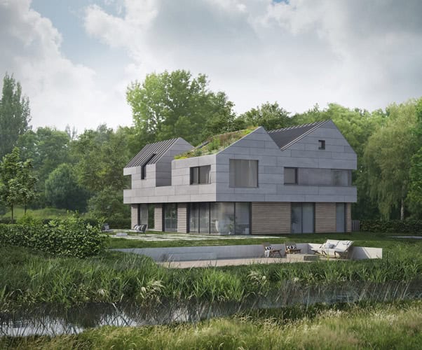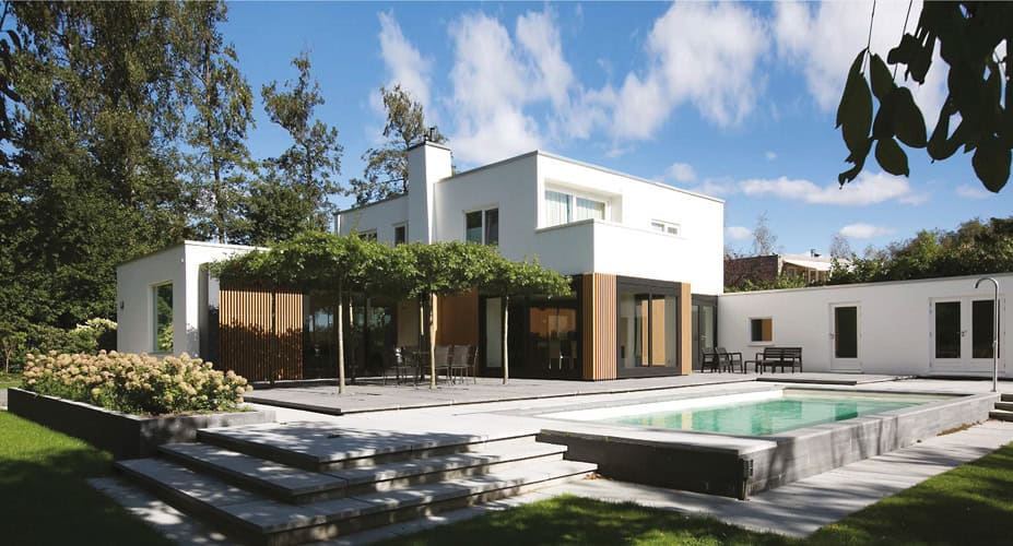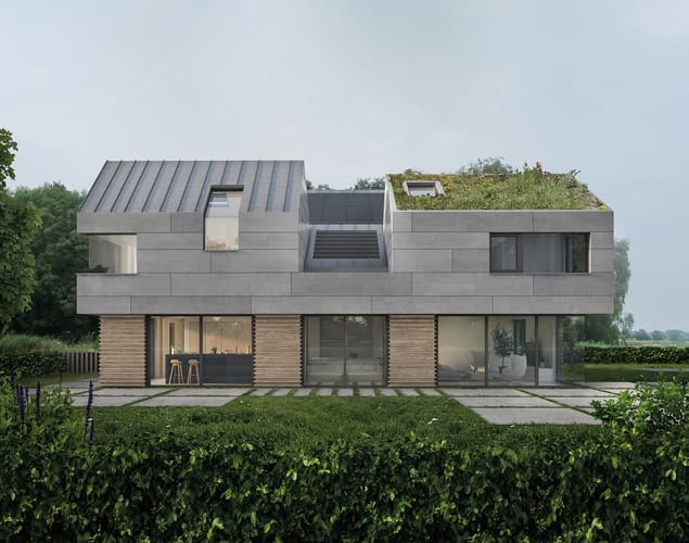 Marco: ‘Bij de inschrijving voor deze kavels hanteerde de gemeente een ‘menukaart’ van duurzaam bouwen: hoe hoger het aantal punten hoe groter de kans dat je een kavel kreeg toegewezen. Daarom hebben we gekozen voor een verhoogde isolatienorm die in het bouwbesluit wordt gehanteerd. Zo zijn bijvoorbeeld alle kozijnen voorzien van triple glas ipv dubbelglas. Ook wordt op een duurzame manier energie opgewekt door toepassing van zonnepanelen en zonnecollectoren, in combinatie met een grondgebonden warmtepomp. Regenwater wordt hergebruikt voor douchewater en het spoelen van de toiletten. Het gevelmateriaal bestaat uit Equitone en PEFC (ecologisch verantwoord) eikenhouten geveldelen en zink. Door het gebruik van natuurlijke materialen met een karaktervolle uitstraling is dit een voorbeeld van warm modernisme’