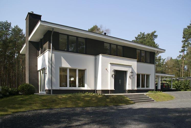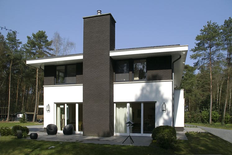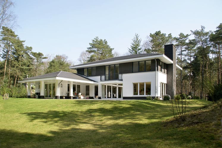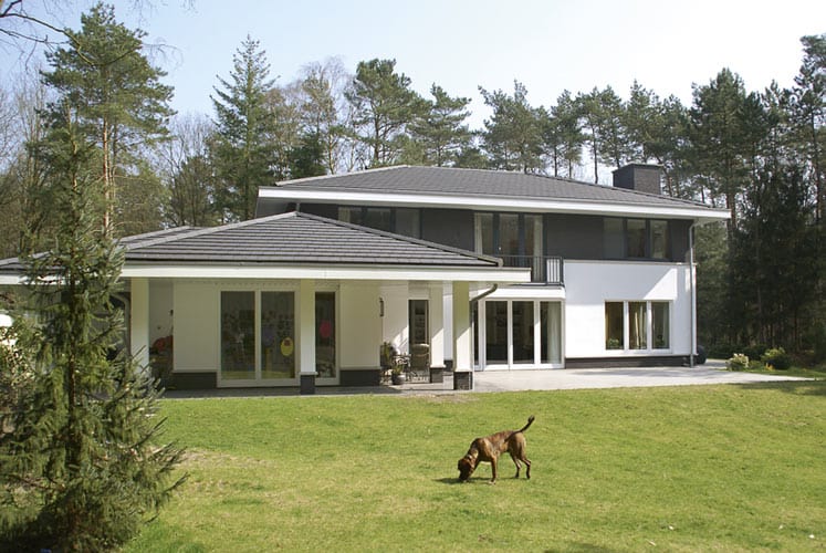 De opdrachtgever van de afgebeelde villa in Bosch en Duin heeft affiniteit met de stijl van Frank Lloyd Wright, de invloedrijke Amerikaanse architect (1867-1959) wiens werk bekend staat om zijn horizontaliteit in de opbouw, geometrische figuratie en ruimtelijke versmelting van binnen en buiten. Het ontwerp van Franx-Schreuder wordt dan ook gekenmerkt door horizontale lijnen in de gevel, grote dakoverstekken en een verticaal accent van de robuuste schoorsteen. De afwisseling van pleisterwerk en metselwerk in de gevels, de contrastrijke kleurstelling en de symmetrische indeling geven de villa een eigen gezicht met invloeden van de Frank Lloyd Wright-stijl. Een markant woonhuis waarin de opdrachtgever zich prettig en thuis voelt.