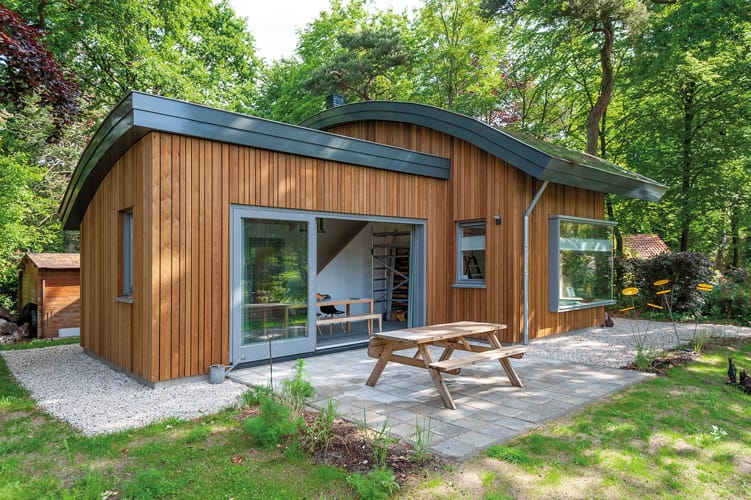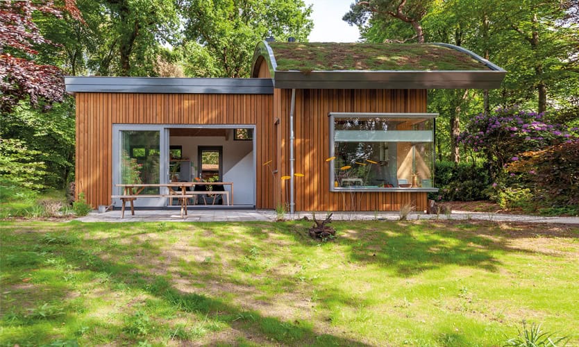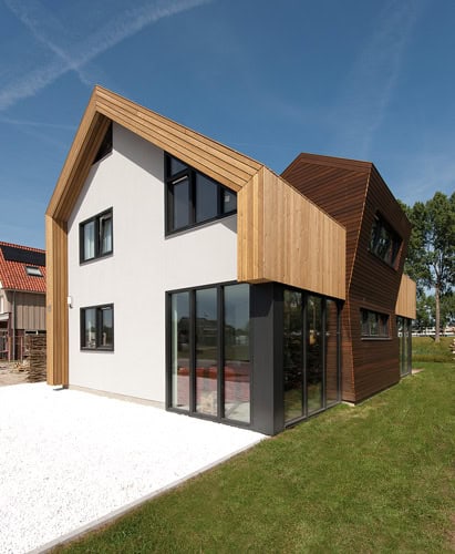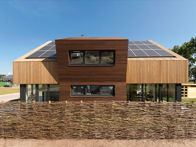 Constructie: dampopen houtskeletbouw. Gevelmateriaal: houten betimmering (open gevelbekleding), triple glas en stucwerk.