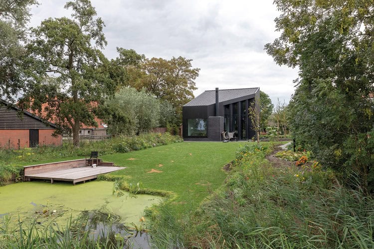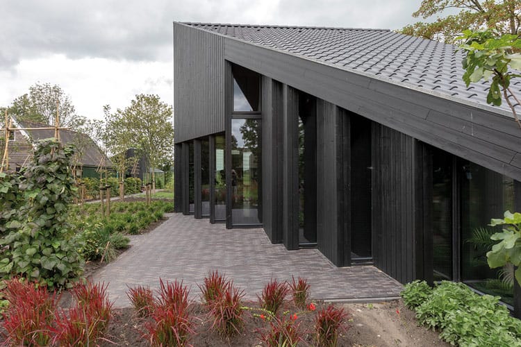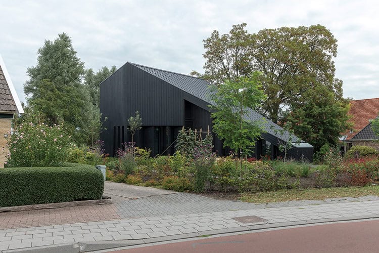 De smalle kavel en de wens om een huis met rondom een tuin te realiseren heeft geleid tot het ontwerp met hout en steen van het Erkerhuis. De gevel is een schoepenwand die het uitzicht en de privacy regelt. Open naar de tuinen voor en achter, geslotener naar de zijkanten. Je kunt er niet makkelijk naar binnen kijken, maar van binnenuit beleef je een prachtig uitzicht en de schoepen zorgen voor een spannend ritme in de woonruimtes. Aan de achterkant springt het volume terug bij de uitgemetselde open haard en ontstaat er een beschut, windluw buitenterras met prachtig uitzicht naar de weilanden.