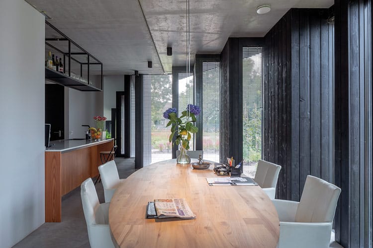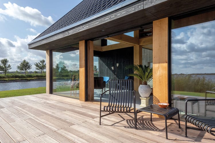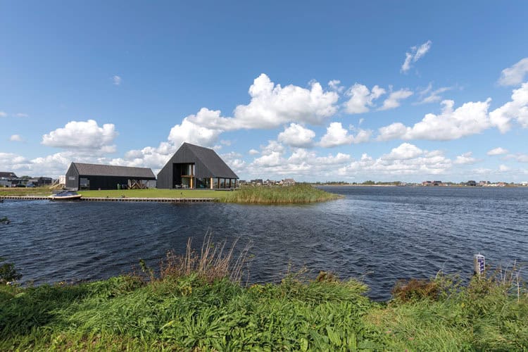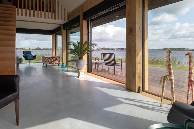 Het Meerhuis staat op een locatie met veel water en een schitterend uitzicht. De veranda’s zorgen voor windluwe, watervrije plekken waarin de zon of schaduw opgezocht kunnen worden. Naast het overdekte terras heeft het huis aan twee kanten een inverted erker, die zorgt voor overhoeks uitzicht en veel daglicht in de woning. Het ontwerp is gebaseerd op een houten gebintenstructuur van 6x6x6 meter, die zichtbaar de rode draad door het hele huis vormt. Centraal op de begane grond vormt een grote woonkeuken, die als houten megameubel via de trap naar de verdieping loopt, de spil van het huis.