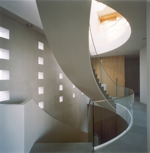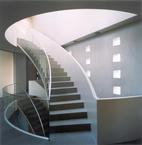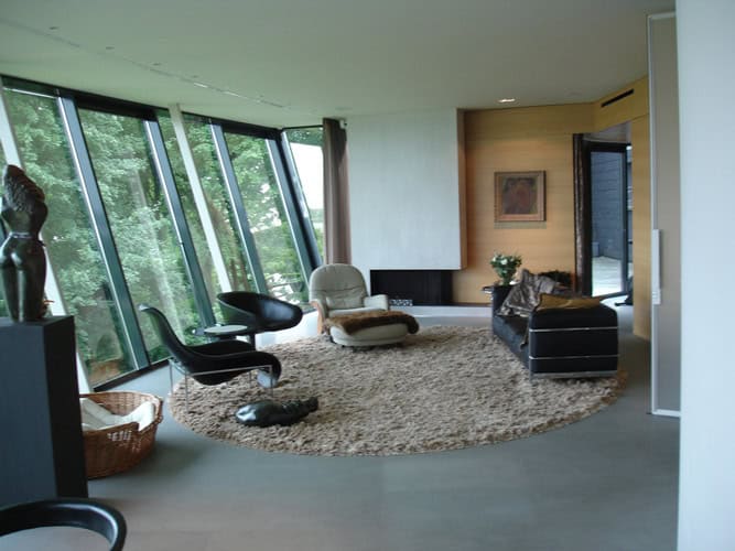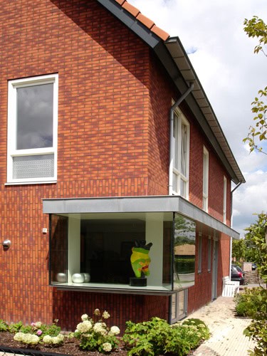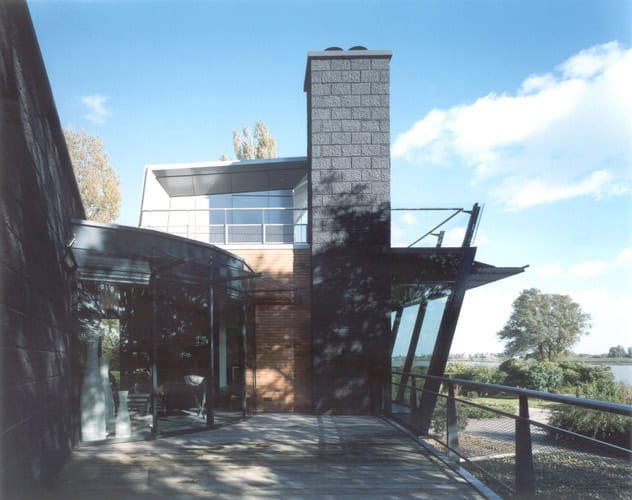 We realiseren binnen het beschikbare budget een optimale woning.’ De woning in Nootdorp wordt getypeerd door modern traditionalisme. De villa aan de rivier door duurzaam modernisme. In het baksteengebruik zijn details te zien, de luifel geeft schaduw, beschutting en een dynamische lijn die de bocht van de rivier en de stand van de zon volgt. Het ronde trappenhuis is het moderne hart van de woning.