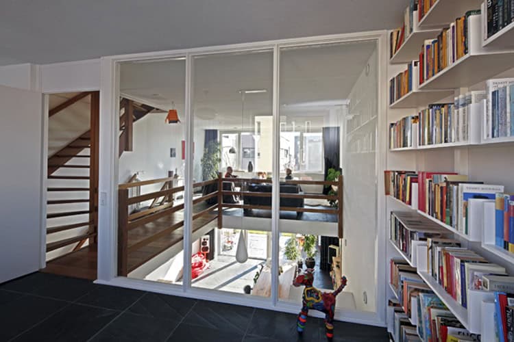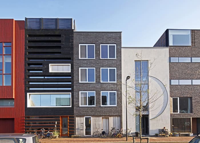 De stadsvilla op IJburg heeft een meer modernistische uitstraling: introvert met nadruk op goede verhoudingen. De onderhoudsvrije materialen – aluminium met gesinterde strengpersstenen en vergrijzend hout – zorgen voor een subtiele schakering en dragen bij aan waardevastheid.