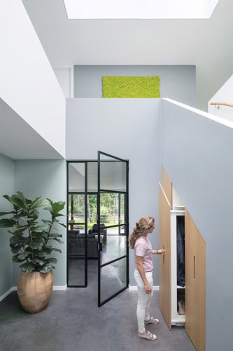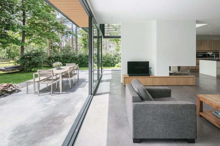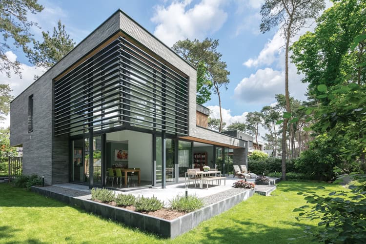 Zo hebben wij bijgaande moderne villa in de bossen van Zeist ontworpen. De omgeving kenmerkt zich door een rijkelijk begroeid landschap met ranke dennen en winderige heidevelden. Ruwe materialen, zoals betonsteen, hout en antracieten kozijnen zorgen ervoor dat de woning opgaat in het omliggende landschap. De woning optimaal laten versmelten met het landschap betekende ook rekening houden met de al aanwezige bomen, waardoor de woning perfect in haar omgeving geïntegreerd is.’