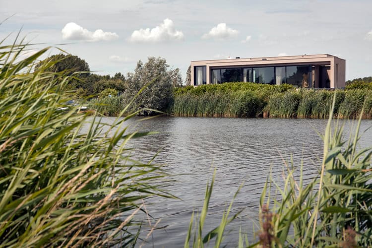 De architecten worden geïnspireerd door Zwitserse en Scandinavische moderne architectuur en hebben een voorliefde voor robuuste en eerlijke materialen die mooi verouderen. Ze benutten de kwaliteiten van de locaties en onderscheiden zich door een heldere stapeling van diverse bouwkundige ingrediënten, zoals een daklandschap met niveauverschillen, een in het zicht zijnde draagstructuur van staal en metselwerk, heldere openingen voor daglichttoetreding en begrijpelijke plattegronden. De eenlaagswoning in Reeuwijk heeft door zijn positionering aan drie gevels uitzicht over de Reeuwijkse plas en de skyline van Gouda. Door toevoeging van een tweetal lessenaarsdaken ontstaan er door de dubbele plafondhoogte bij de eetkamer en bij de hoofdslaapkamer bijzondere ruimtes met extra lichtinval en uitzicht. Bouwtechnisch is gekozen voor een combinatie van een stalen draagstructuur en traditioneel metselwerk. Een combinatie die de hele woning makkelijk aanpasbaar maakt aan eventuele toekomstige wensen.