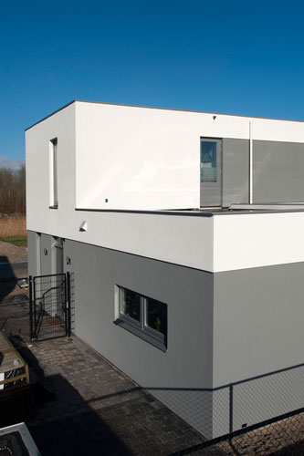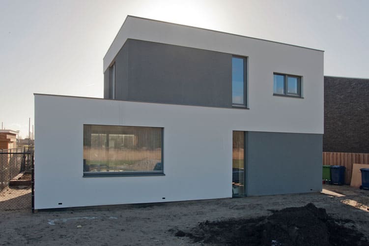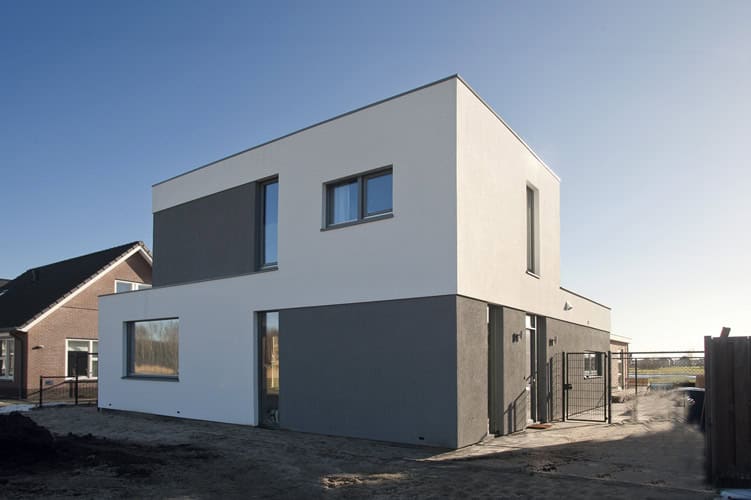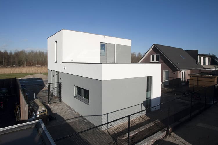 De woning in Almere wordt gekenmerkt door een spel van wit en antraciet stucwerk. Hierdoor is een spannend, dynamisch beeld ontstaan. Door de dakterrassen en de pui aan de achterzijde loopt het interieur door in het exterieur. Door de vorm van het gebouw is een intiem beschut terras ontstaan. In het interieur lopen de ruimtes in elkaar over.