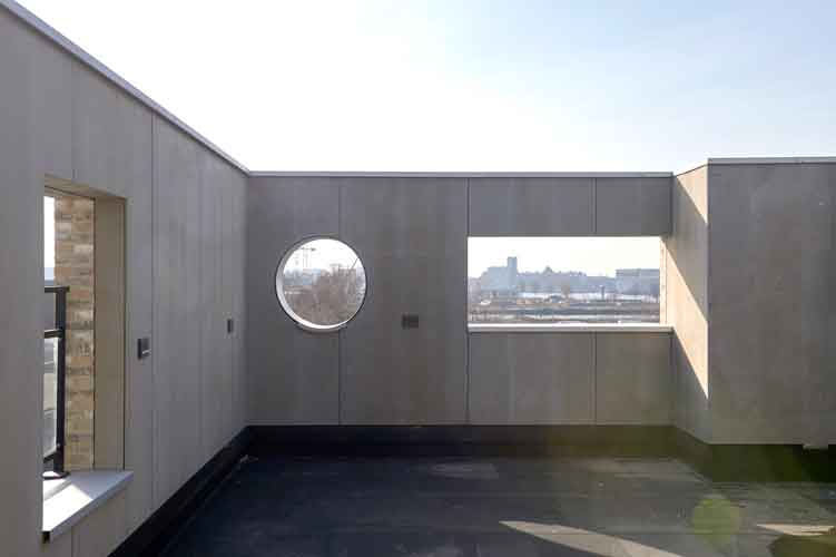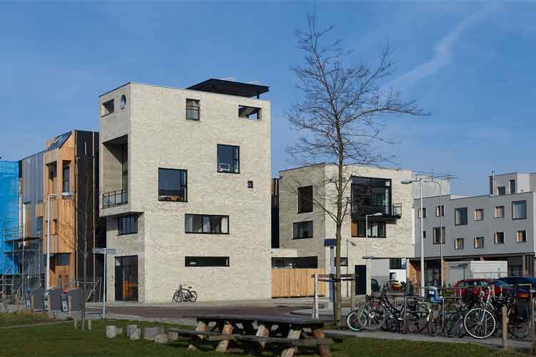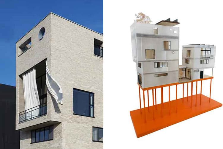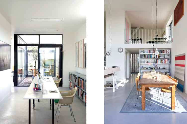 Eigenlijk zijn het twee huizen op één kavel. Een huis om in te wonen en werken en een huis om te verhuren. Met een gevel van een zanderig gemêleerde baksteen, die meekleurt met het licht. En heel veel grote ramen, als vensters op de stad. Een opengewerkte muur speelt met het ochtendlicht. Op de begane grond, tussen onze ateliers in, groeit een Japanse tuin. En op het dak wordt een secret garden aangelegd, met een vijver en twee bomen. Zo halen we de natuur in huis. Duurzaam is het sowieso, met zonnepanelen, een waterberging, douches met warmteterugwinning.