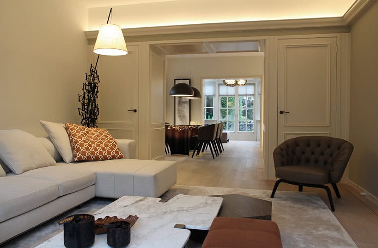 Koen van der Donk: ‘Wij maken vooral gebruik van maatwerk bij het ontwikkelen van kastenwanden en tafels. Dankzij samenwerking met verschillende hoogwaardige meubelmakers slagen we erin om uniek werk te leveren. Wij doen dat zoveel mogelijk inhouse, omdat we dan de kwaliteit kunnen waarborgen. Als we iets niet zelf kunnen leveren of maken zoeken we in ons netwerk naar een geschikte partner.